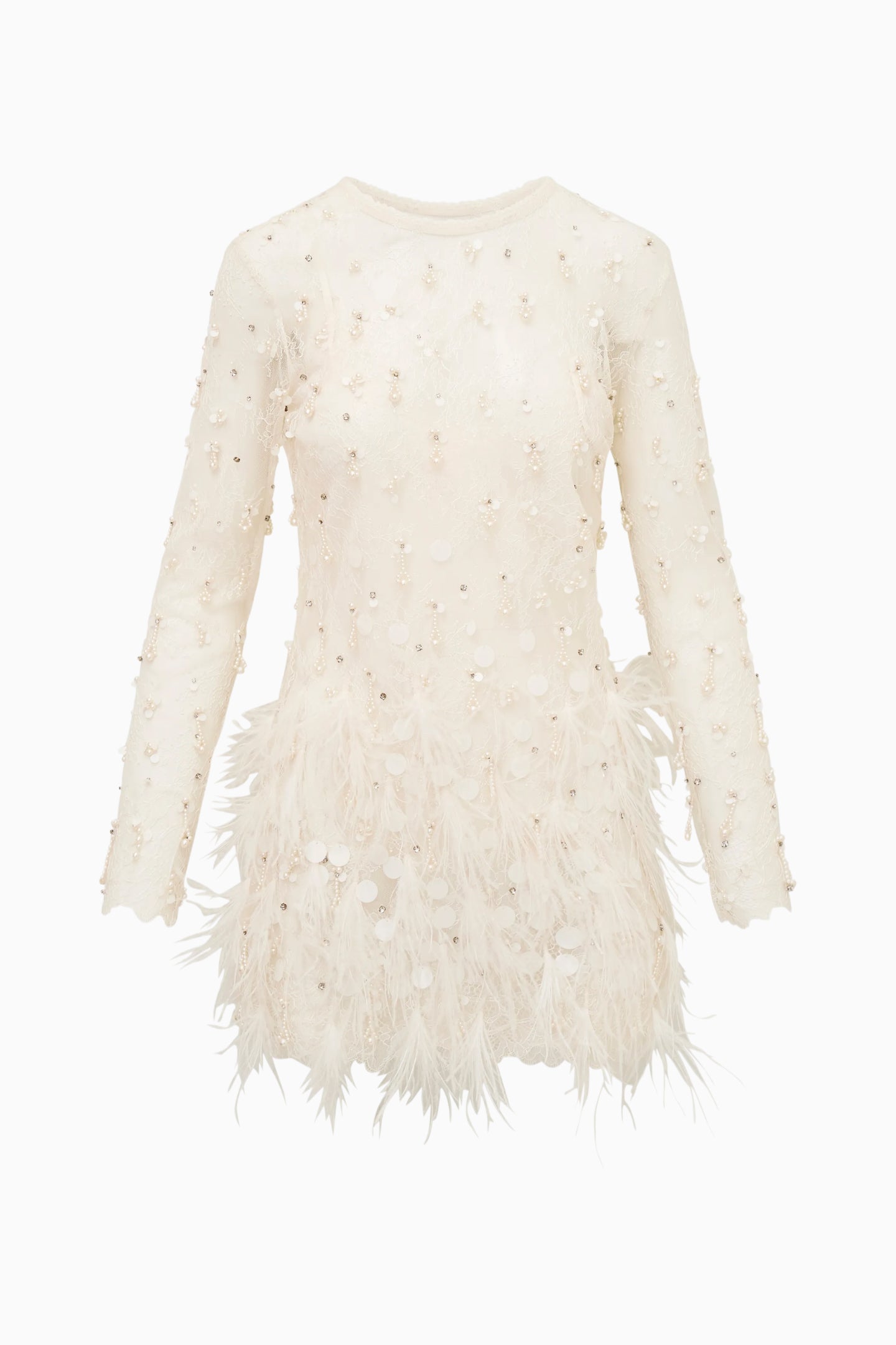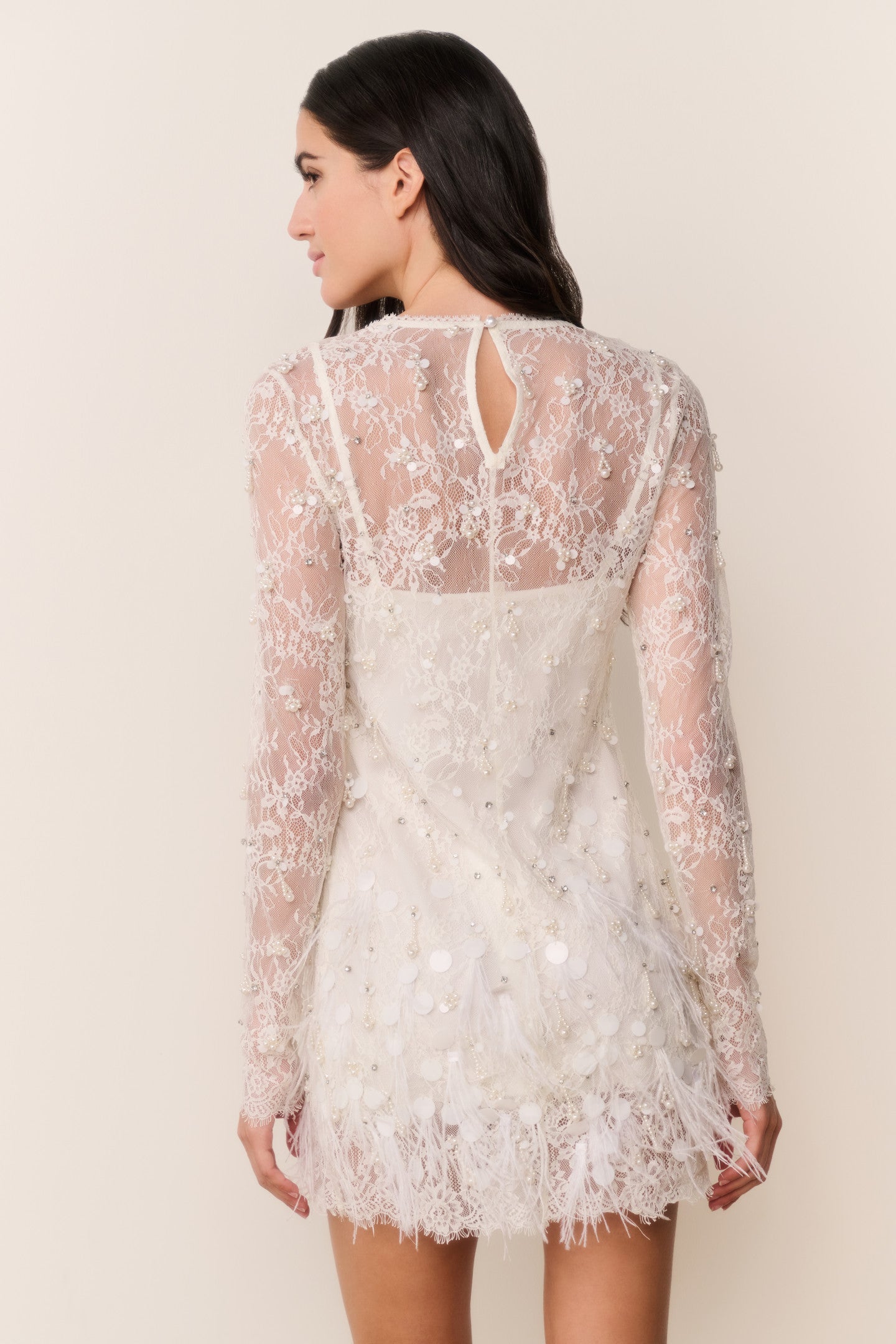 The Alouetta Dress is an over-the-top mini crafted from delicate Chantilly lace. perfect for festive or special occasions. Designed with a crewneck and long sleeves. the dress features cascading pearl drops. rhinestones. and sequins throughout. with feathered detailing at the back skirt. A keyhole at the back adds a subtle peek. and it comes with a lace-edged slip cami for coverage and comfort.