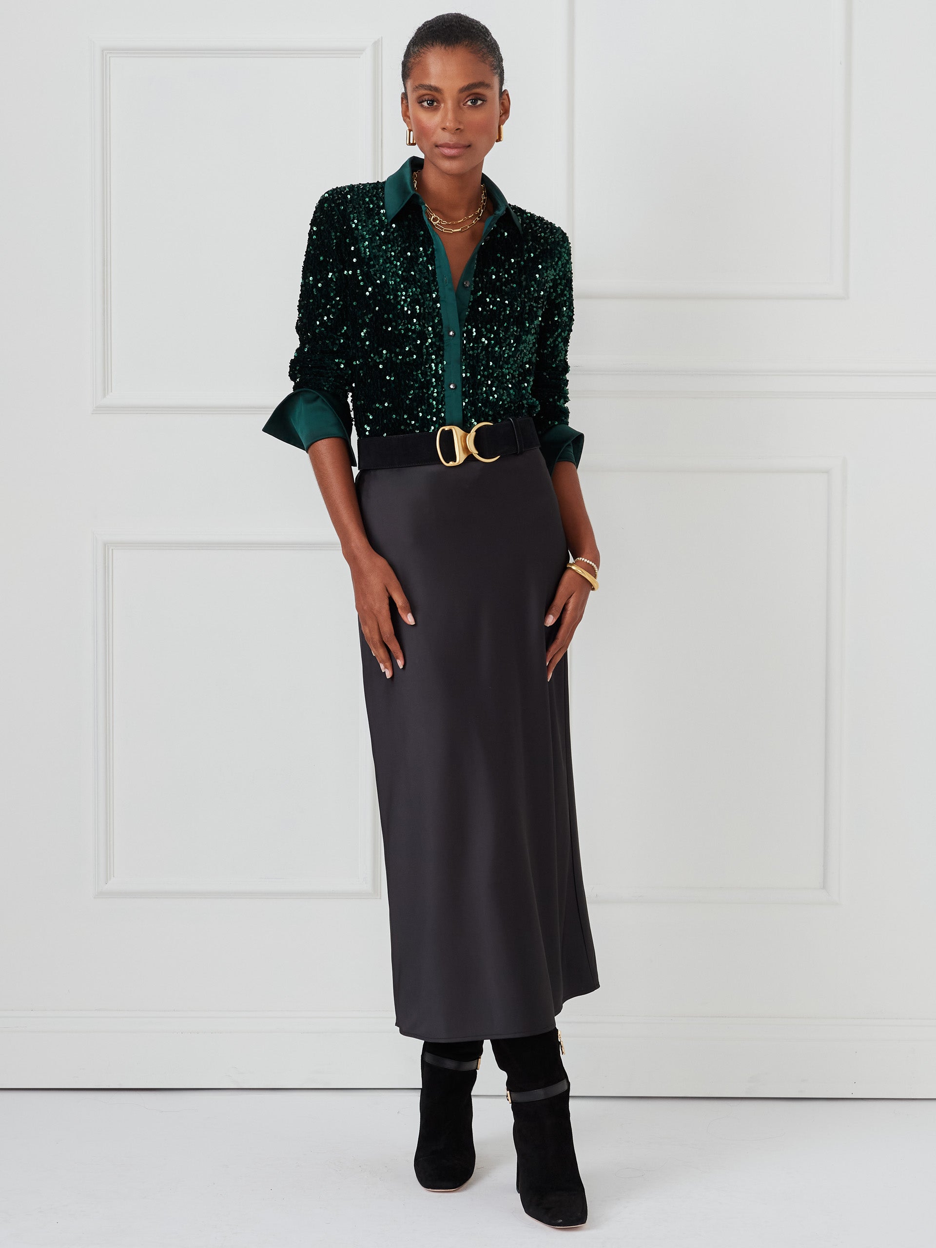 The button-down that steals the show. Barrett’s sequin finish and satin contrast details make it a polished way to shimmer from desk to dinner.