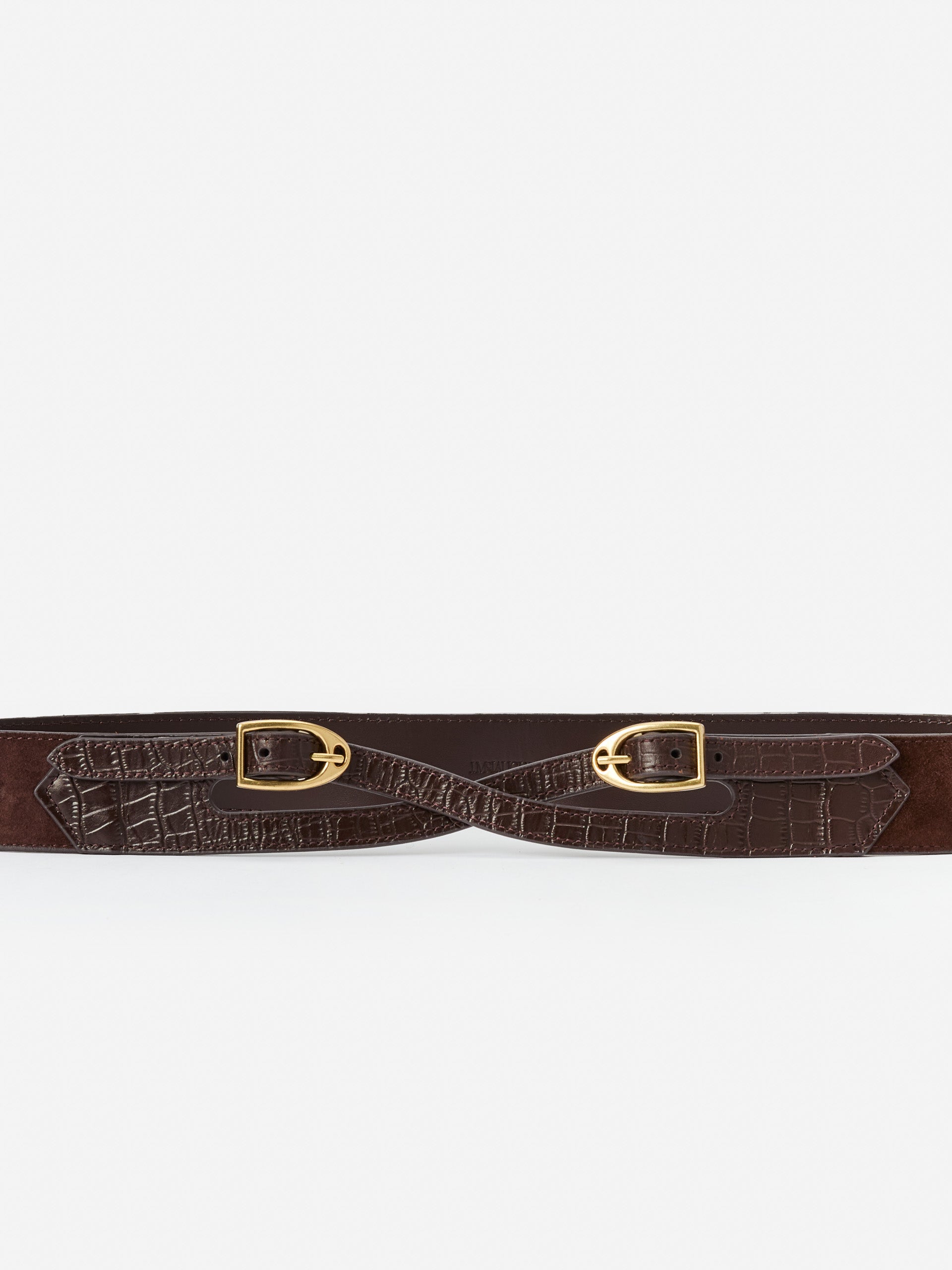Add a bold finish with the Jimena Belt—crafted from supple suede and crocodile-embossed leather. Twin buckles bring a hint of equestrian-inspired charm, making it the versatile accessory your wardrobe needs.