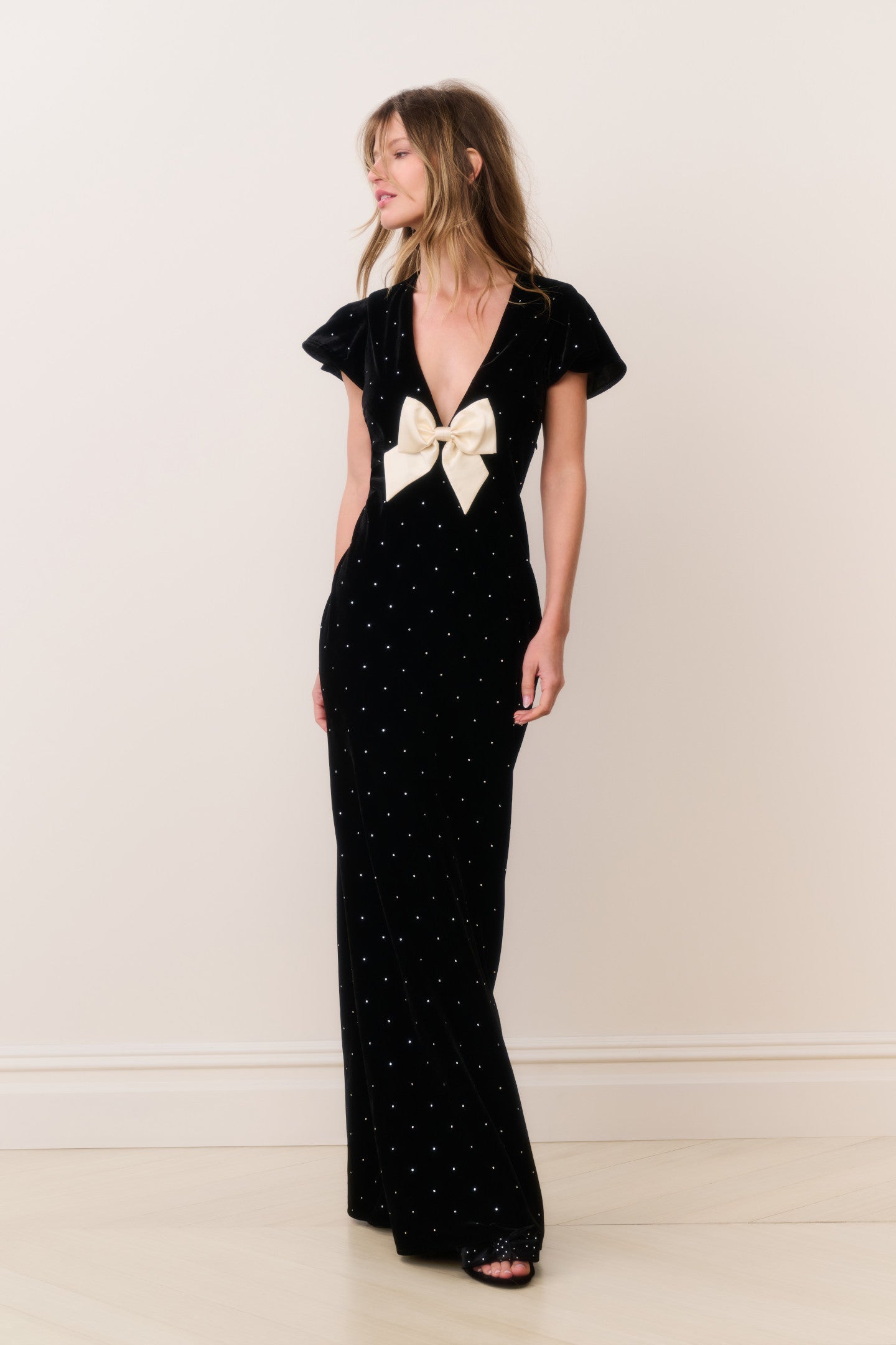 Festive and romantic. the Melora Dress makes its debut. Crafted from velvet with heat-fixed crystals. the dress shimmers subtly across the bias-cut fabric. highlighting its deep V-neckline and vintage-inspired butter sleeves. The empire waist and fishtail skirt create a graceful. flowing shape. while a soft ivory bow at the front neck adds a signature LoveShackFancy accent.