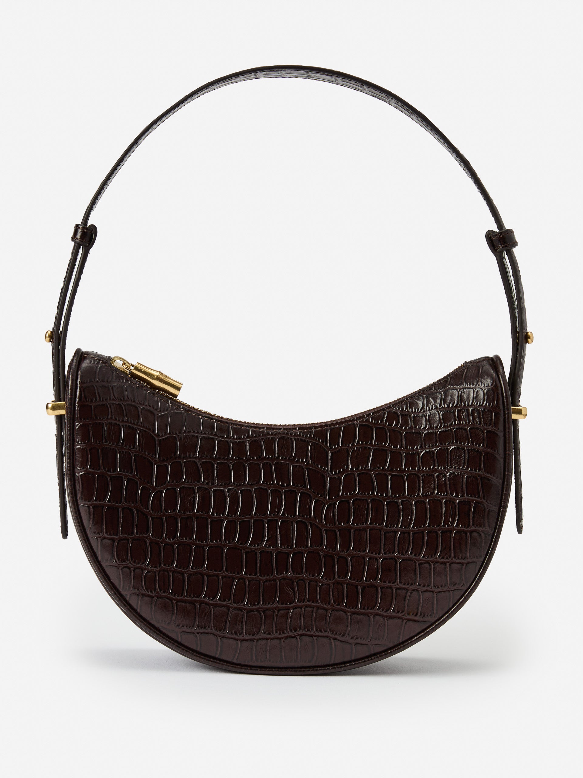 In a distinctive crescent shape, the Mezzaluna handbag fits perfectly on your shoulder, or you can wear it as a crossbody with the removable strap. Stash your wallet, phone, and keys and be stylishly out the door.