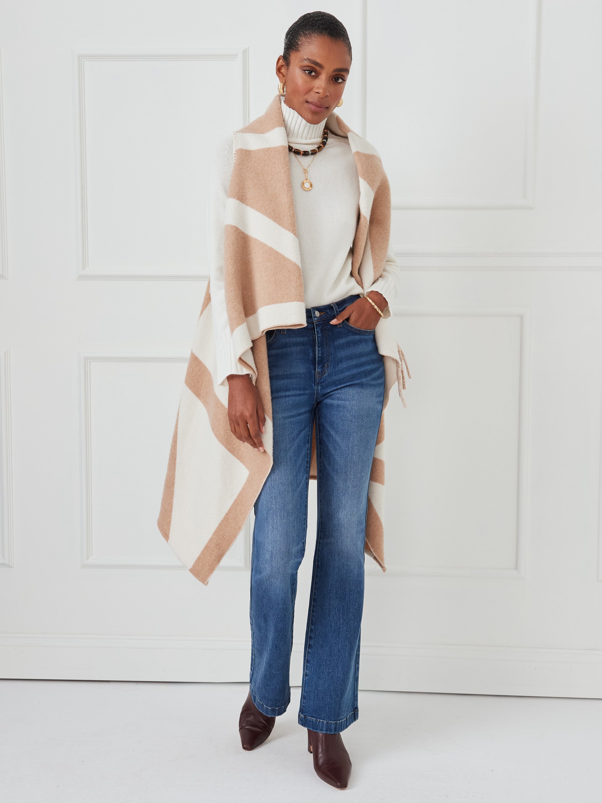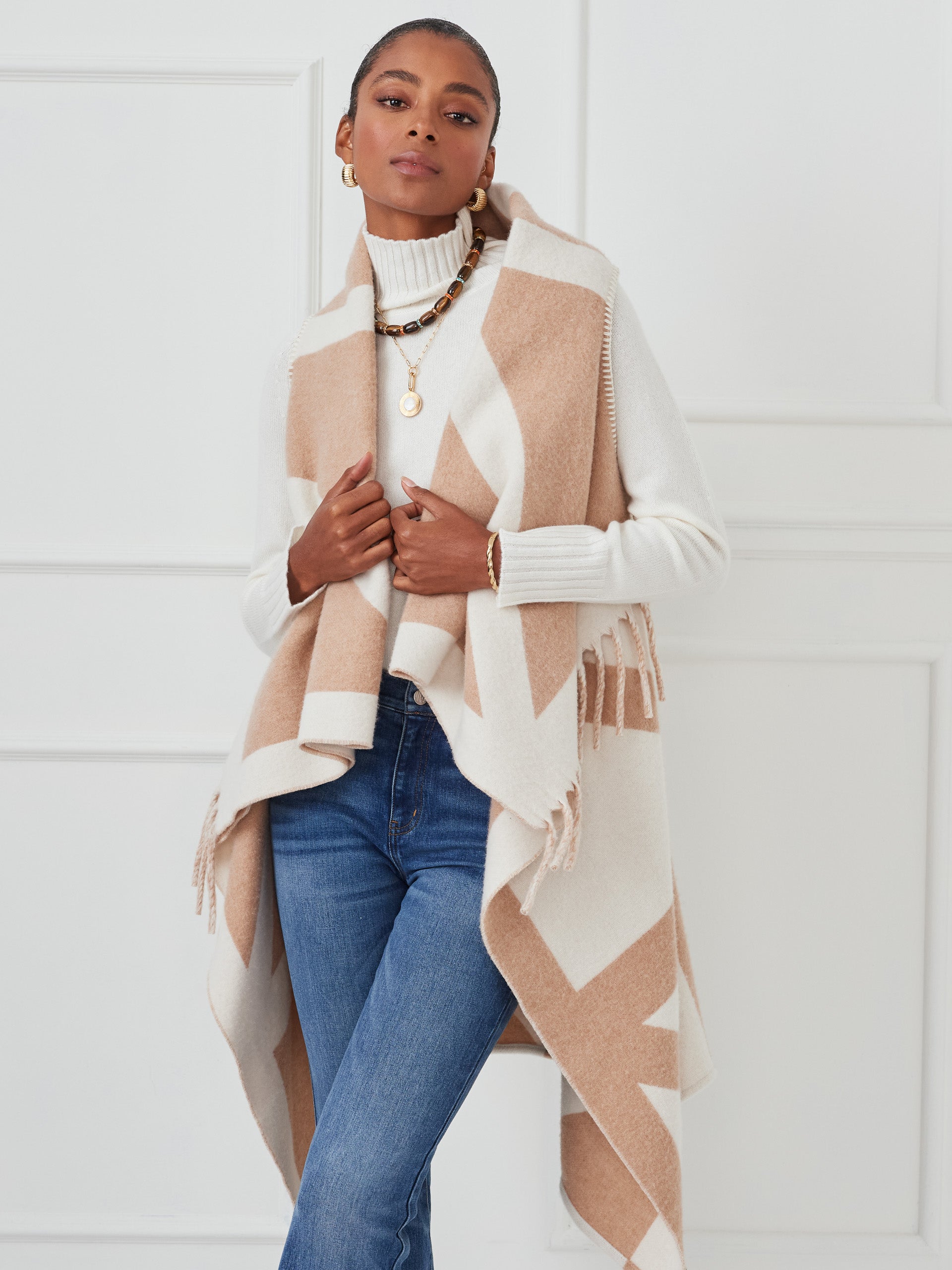 Milda is where vest meets wrap, finished with a touch of fringe. This is layering with personality.