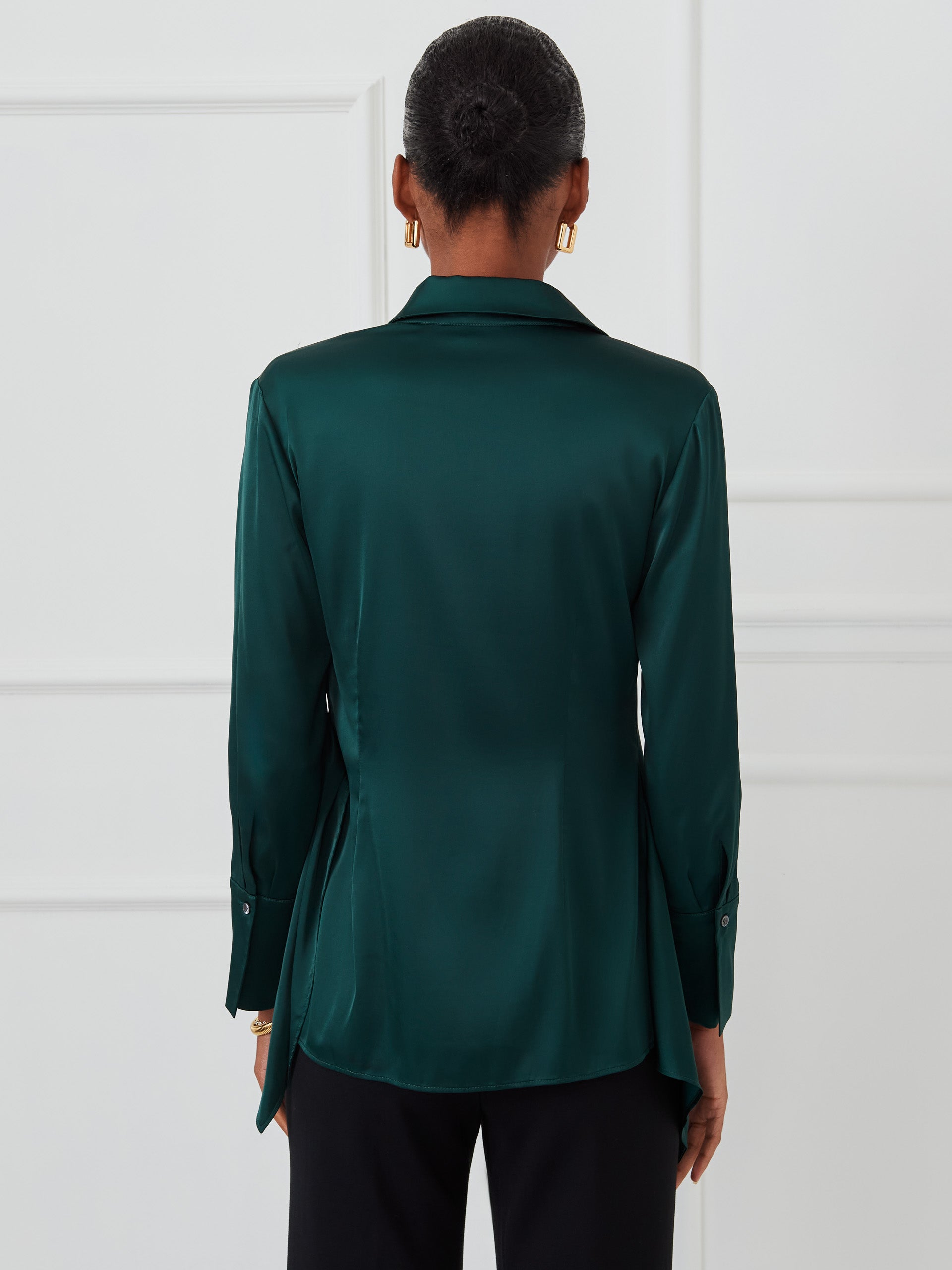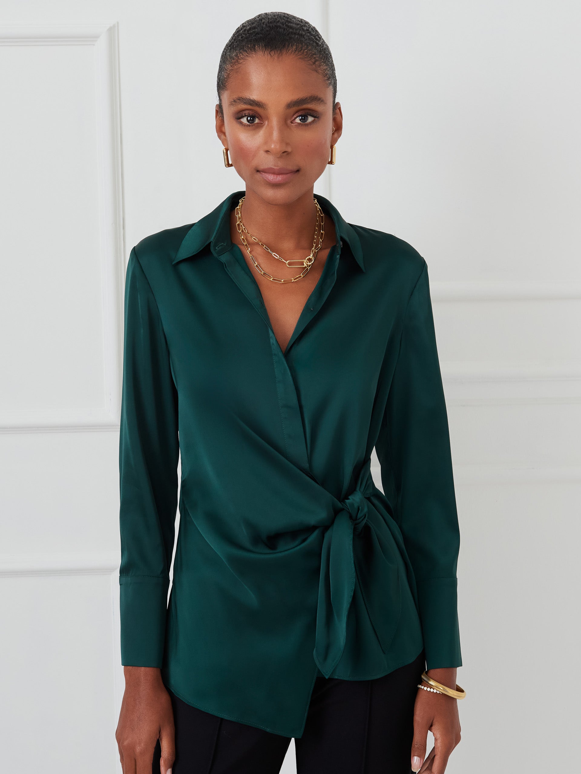 Meet the newest addition to your capsule wardrobe: the Salma, our newest iteration of the timeless button-down shirt, elevated with a tie-waist detail and crafted in a jewel-toned satin.