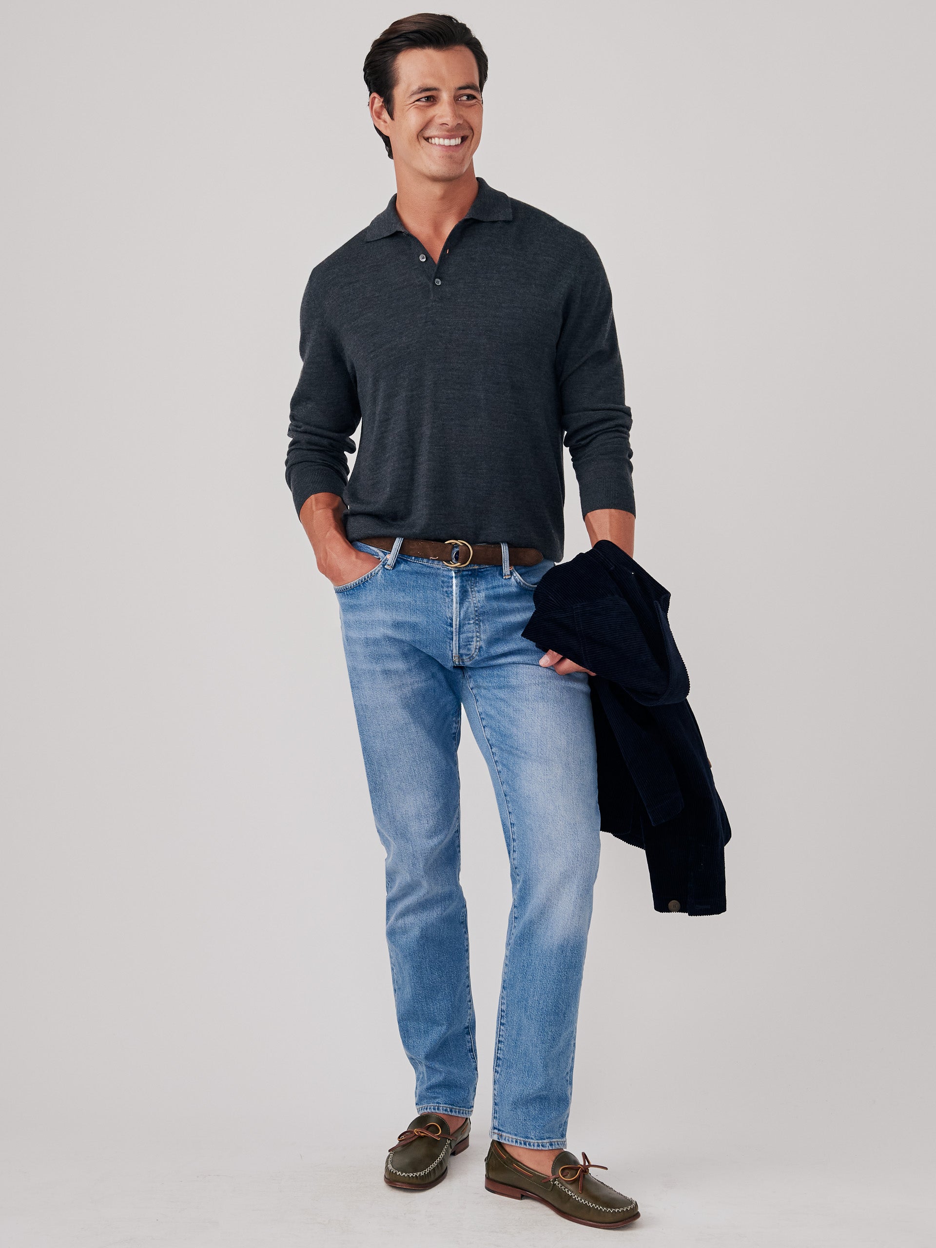 A refined take on the polo shirt, the long sleeve Savona is made from a blend of 75% merino wool and 25% silk for a finer hand feel and a dressier look that pairs effortlessly with a sport jacket.