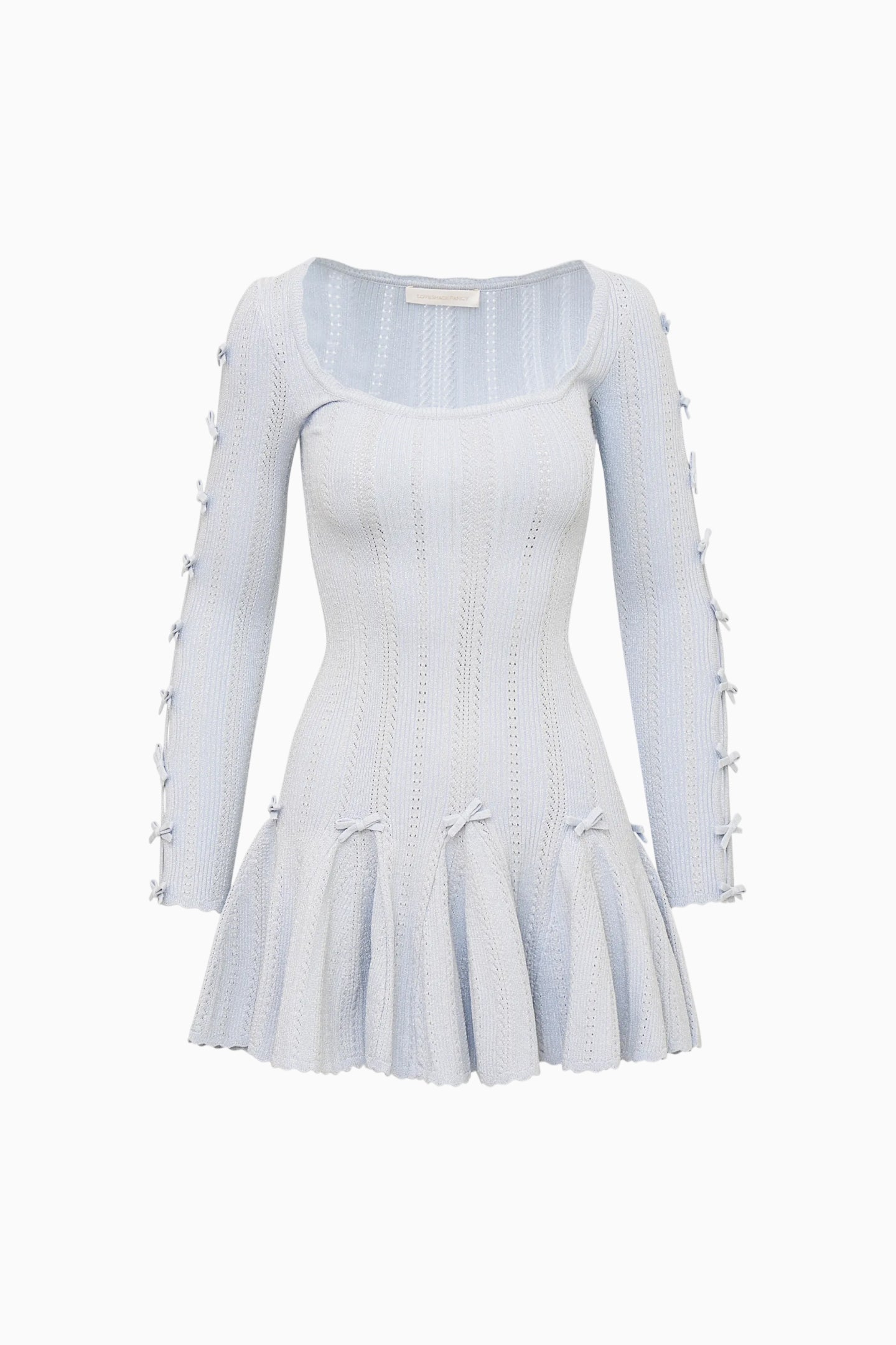 The Seychelle Dress is designed from our ribbed pointelle stitch. a stretchy. compact knit that’s a favorite for effortless style. Featuring a fitted bodice with godet panels that flare into a flowing skirt. it mirrors the flattering silhouette of the Amyranna Dress. A wide scoop neckline and signature keyhole bow detailing at the sleeves and godets add a feminine. playful touch—perfect for warm-weather events or vacation evenings.