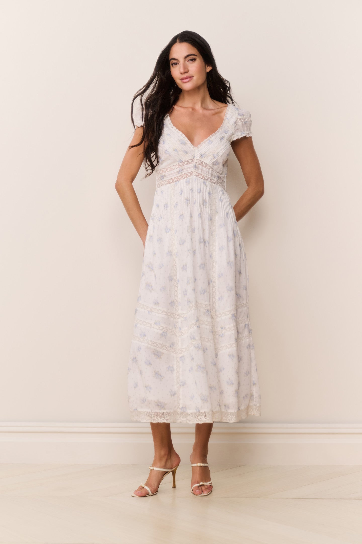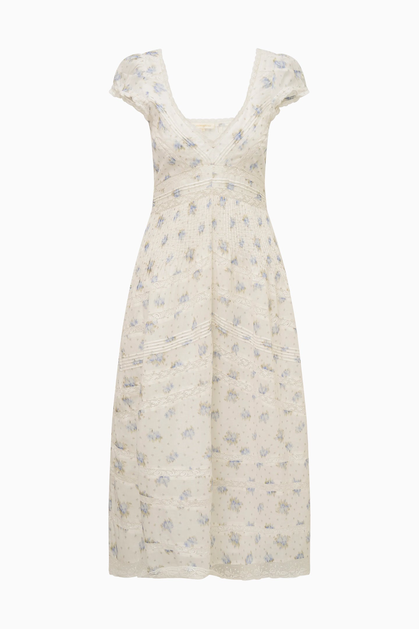 Introducing the Suvi Dress. This Victorian-inspired midi dress stuns with an airy cotton fabric printed with our new. playful confetti bloom print and features vintage-inspired laces all over. The dress begins with short cap sleeves above a v neckline that falls to an empire waist which releases into a sweepy. a-line skirt. There is tucking at the waist giving this piece a feminine silhouette. There’s smocking at the back for ease and comfort and includes pockets.