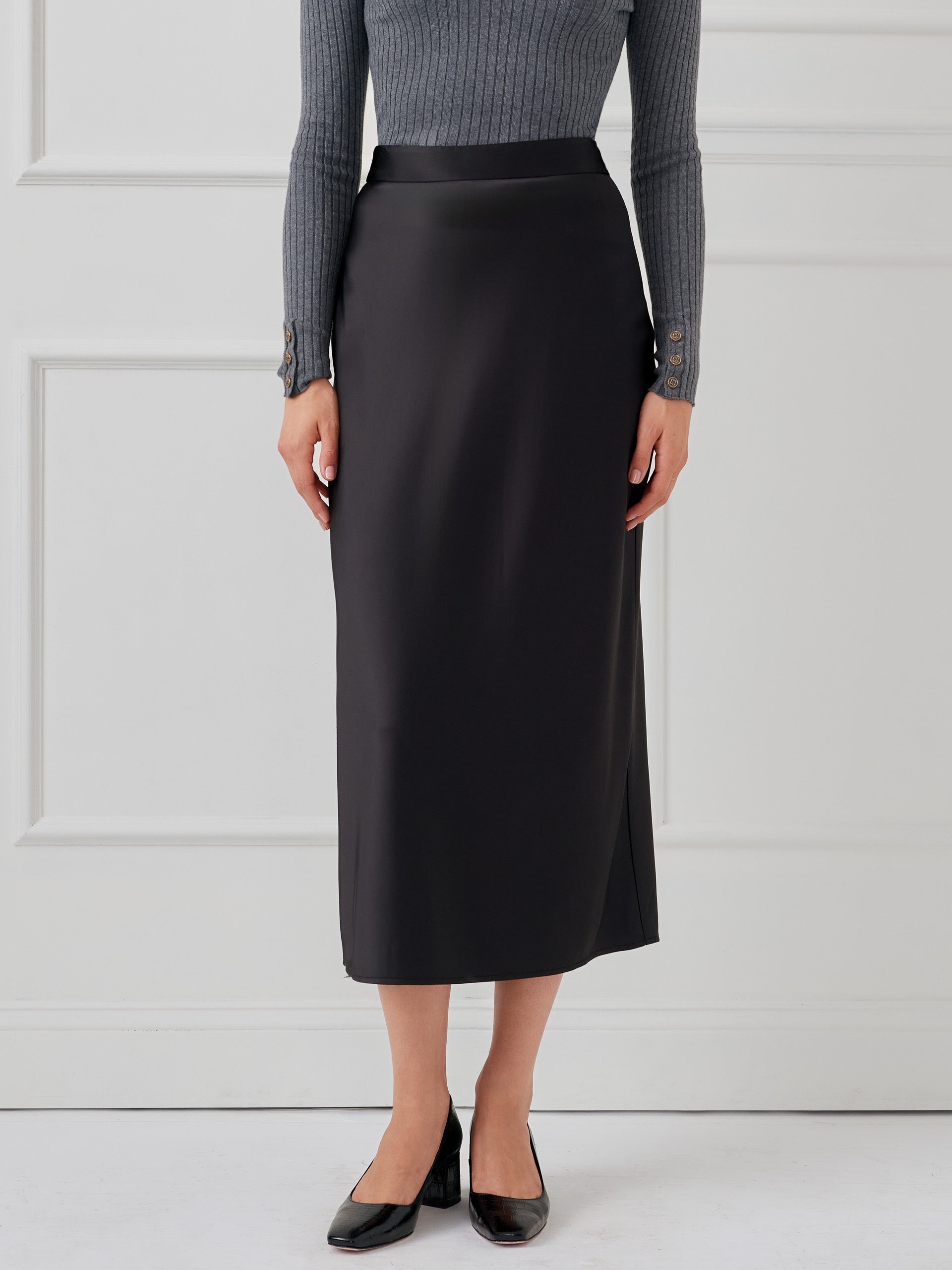 Midi length Side zipper 95% Polyester, 5% Spandex Hand wash cold with like colors. Lay flat to dry. Can be dry cleaned. Imported. Size & Fit36″ long (size 8) Model is 5’9″ and wearing a size 0